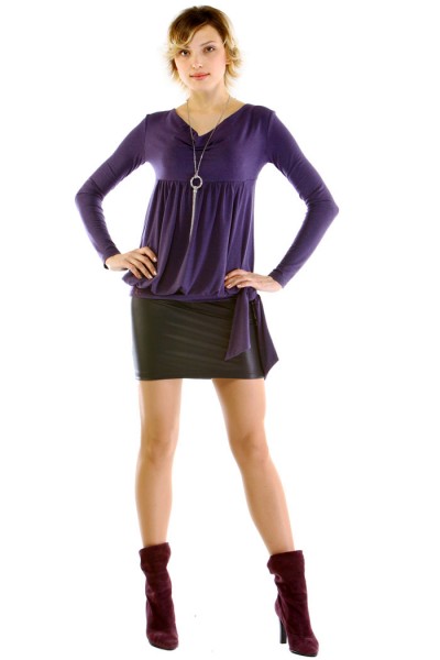 Платье имитирует джемпер и юбку. Верх выполнен из мягкого меланжевого трикотажа, узкая юбка - из высокоэластичной искусственной кожи. Объём регулируется вшитым по спинке поясом-кушаком, с отделкой в виде логотипа из страз.Удачно смотрится во время беременности и отлично маскирует недостатки фигуры после родов, не придавая ей излишнего объёма. Здорово смотрится и без животика. На модели размер 44.