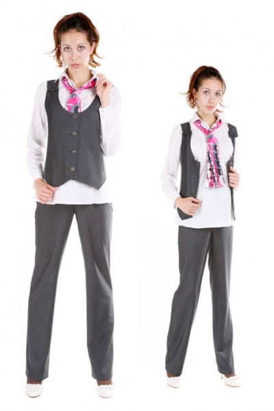 Выполнен из мягкой эластичной костюмной ткани. Объём жилета регулируется за счёт растяжимых трикотажных вставок по бокам. Брюки классического силуэта на трикотажном поясе-бандаже, объём которого регулируется передвижной резинкой. Костюм удобен как на любом сроке беременности, так и после родов. На фото размер 42.