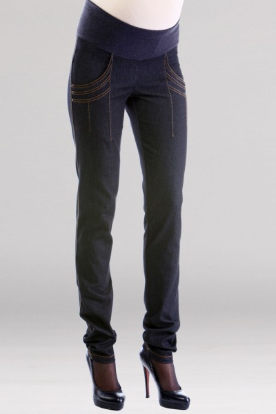 Выполнены из стрейчевой "неварёной" джинсовой ткани, силуэт заужен по ноге (на фото размер 42). Бандаж из эластичного трикотажа. Объём регулируется передвижной резинкой. На бёдрах отделка из страз и декоративных строчек. Удобны как на любом сроке беременности, так и после родов.