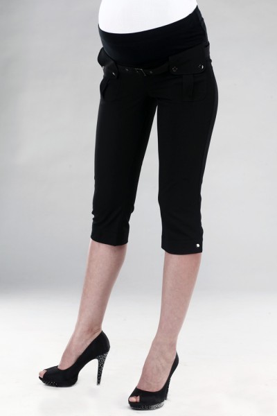 Брючки-капри зауженного силуэта выполнены тонкой стрейчевой костюмной ткани. Пояс-бандаж "под живот" регулируется передвижной резинкой. Декорированы пояском с пряжкой, продетым сквозь интересные карманы-шлёвки. Низ брючин в виде манжет на кнопках. Полностью соответствуют офисному дресс-коду.Удобны как на любом сроке беременности, так и после родов.